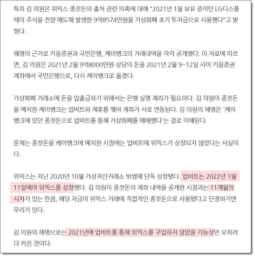 하지만 위믹스 코인은 김남국 의원의 시점보다 11개월 후인 2022년 1월에 상장되었습니다.