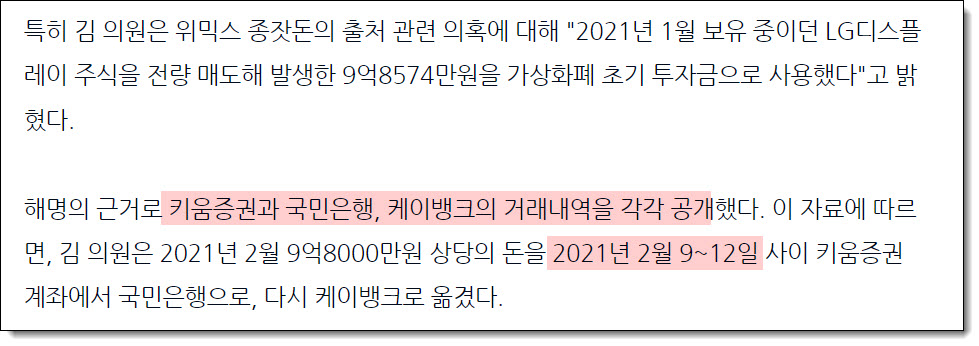 김남국의원 본인이 제시한 증거에 따르면 분명히 키움-국민-케이 뱅크로 9억8천억원을 옮겨, 2021년 2월중에 구매한것입니다.