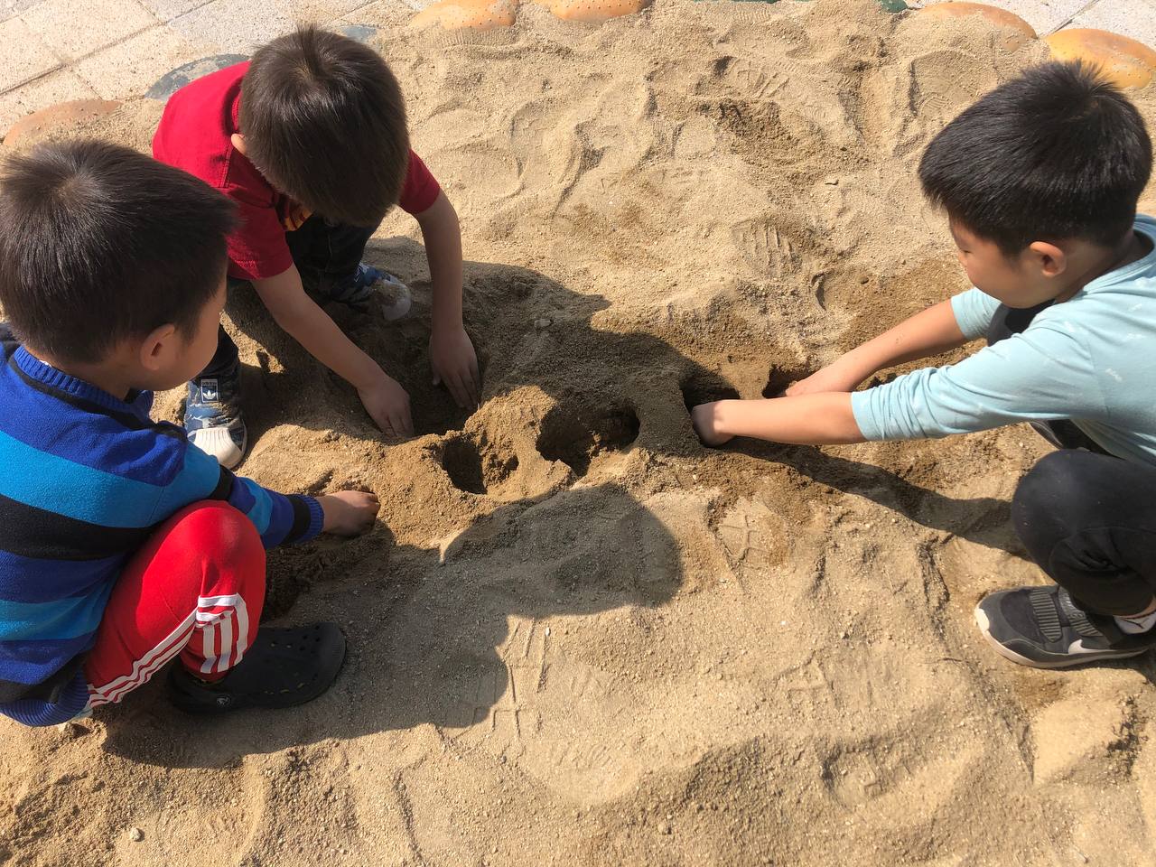 반팔과 내복만 입고 맨손으로 모래놀이를 했다.